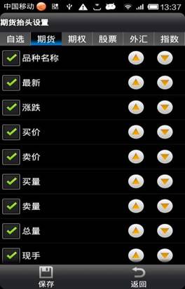 ◇ 設(shè)置自選、期貨、期權(quán)、股票、外匯、指數(shù)等六大市場(chǎng)顯示的抬頭字段及字段的順序。