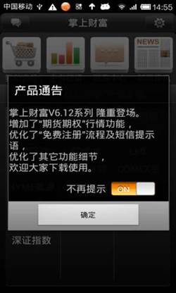 ◇ 顯示通告:設(shè)置掌上財(cái)富軟件登錄后是否顯示通知消息框,默認(rèn)為“顯示通告信息”,