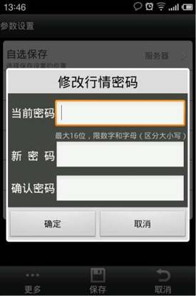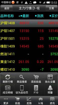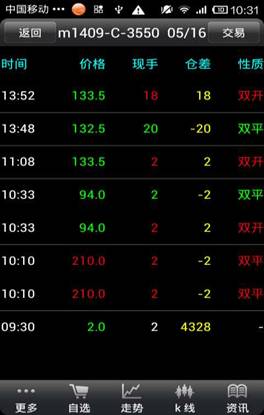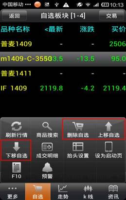 品信息,點(diǎn)擊“更多”可以商品搜索,刪除自選、上、下移自選,成交明細(xì),抬頭設(shè)置,