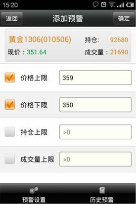 ◇ 可以對(duì)價(jià)格上限,價(jià)格下限,持倉(cāng)上線,成交量上限做預(yù)警設(shè)置,價(jià)格上限和價(jià)格下限
